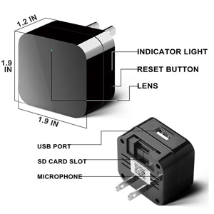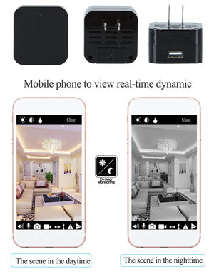 Wifi Spy Hidden Camera Motion Detection Night Vision USB Wall Charger Camera Pixel: 12.0 megapixel CMOS Resolution: 1080P/720P Video format: AVI Frames: 25 View angle: 90 Distance of motion detection shooting:6 m straight-line distance Compressed format: H.264 Sound recording range: 2 square...View more
