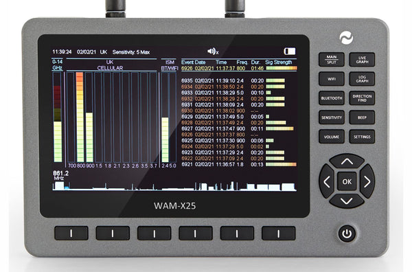 The WAM-X25 Wireless Activity Monitor is a compact tablet-style, multi-band Radio Frequency (RF) signal detector for handheld or desktop use. It is designed for detection and logging of transmissions from all types of radio frequency devices. The WAMX25 provides complete coverage and logging of all RF activity in the surrounding area.
